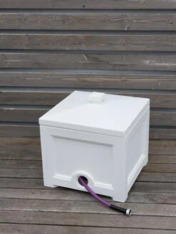 Keep garden hoses handy yet out of sight with this attractive hose storage bin. With clean lines and raised panel detailing, it resembles wood, yet it’s virtually maintenance free because it’s made from high quality polyethylene — there’s no need for annual painting or staining. Like our Fairfield planters, it has the best UV protection in the industry, with a 15-year guarantee against fading. Feed the end of the hose through the 2″ opening at the base and attach to the spigot. Holds up to 100 feet of standard garden hose.